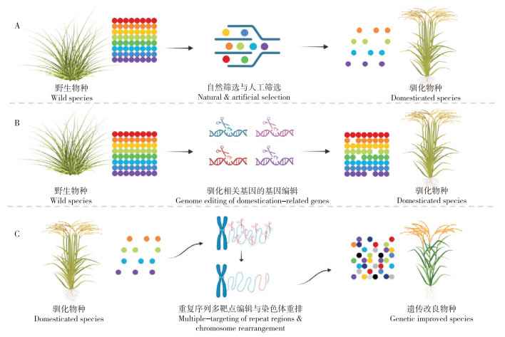 | A:常规育种依赖自然选择与人工选择驯化野生物种;B:从头驯化对某些驯化相关基因进行基因编辑;C:系统性染色体重排靶向基因组范围内的重复区域,引发大规模的染色体变异;不同颜色的圆圈示意不同的遗传变异类型 A: Conventional breeding relies on natural selection and artificial selection to domesticate wild species; B: De novo domestication involves gene editing of certain domestication-related genes; C: Systematic chromosomal rearrangement targets repeat regions within the genome, inducing large-scale chromosomal variation; Different colored circles represent different types of genetic mutations 图 2 提高作物遗传多样性的策略比较 Fig. 2 Comparison of strategies to enhance genetic diversity in crops |