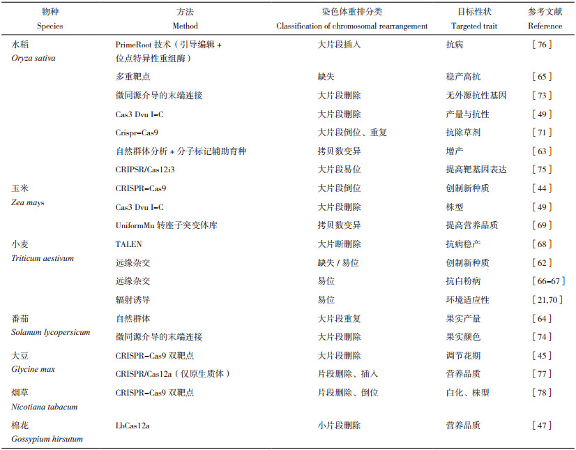 4.2.5 染色体重排技术的其他应用 在新型抗除草剂水稻研发方面,提高水稻中PPO1(原卟啉原IX氧化酶,Protoporphyrinogen IX oxidase)和HPPD(羟基苯基丙酮酸双加氧酶,Hydroxyphenyl pyruvate dioxygenase)的表达量能够提高水稻对相应除草剂的抗性,通过CRISPRCas9系统实现片段倒位和片段重复,分别对PPO1和HPPD基因表达实现了敲高调控,使水稻植株表现出抗除草剂性状[71]。微同源介导的末端连接(Microhomology-mediated end joining,MMEJ)是另一种DNA修复机制,需要基于DSB附近4~25 bp微同源序列(MHS)之间的重组,利用这种机制可有效促进基因组的大片段删除[72]。Tan等[73]利用微同源介导的末端连接体系实现了转基因水稻植株中抗性基因(潮霉素抗性基因)HPT的大片段删除。通过在微同源位点附近设计双sgRNAs,Zhu等[74]也在番茄中实现了大片段删除。LYU等[75]发现基于CRIPSR/Cas12i3的iMAGE系统在水稻中产生的基因组大片段易位效率显著高于CRISPR/Cas9。该技术有望在靶基因上游有强自动子时,被用于大片段删除,以增强靶基因表达的效果。Sun等[76]研究开发了PrimeRoot(Prime editing-mediated Recombination of opportune targets)技术,通过系统整合优化的引导编辑工具和位点特异性重组酶系统,实现水稻中长达11.1 kb大片段DNA的高效精准定点插入,为研究更加复杂的性状和植物合成生物学的应用提供工具(表 1)。